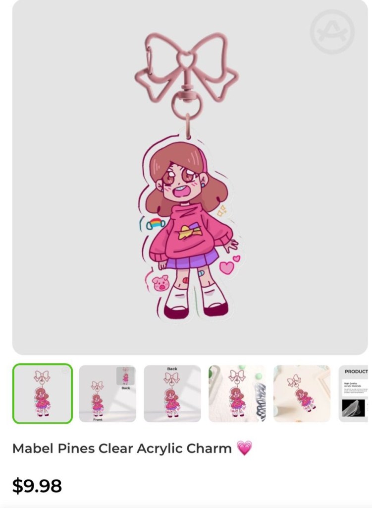 Basically my store sells multifandom merch that appeals to fans who love a more cuter and charming aesthetic to fictional characters, such as Mabel Pines and Momo Ayase!
